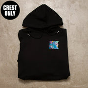 House Music All Night Long. The typography Higher House hoodie with retro triangle graphic fill. Small front print only crest. Printed in-house by us on a unisex heavy-weight 100% Organic Cotton Hood (350gsm).