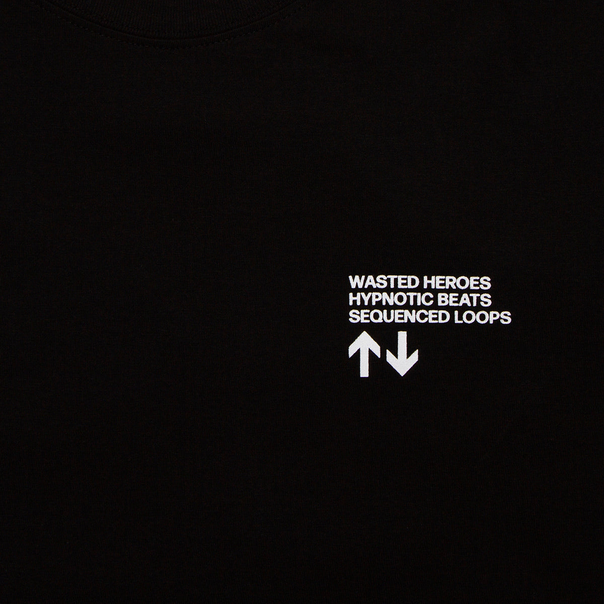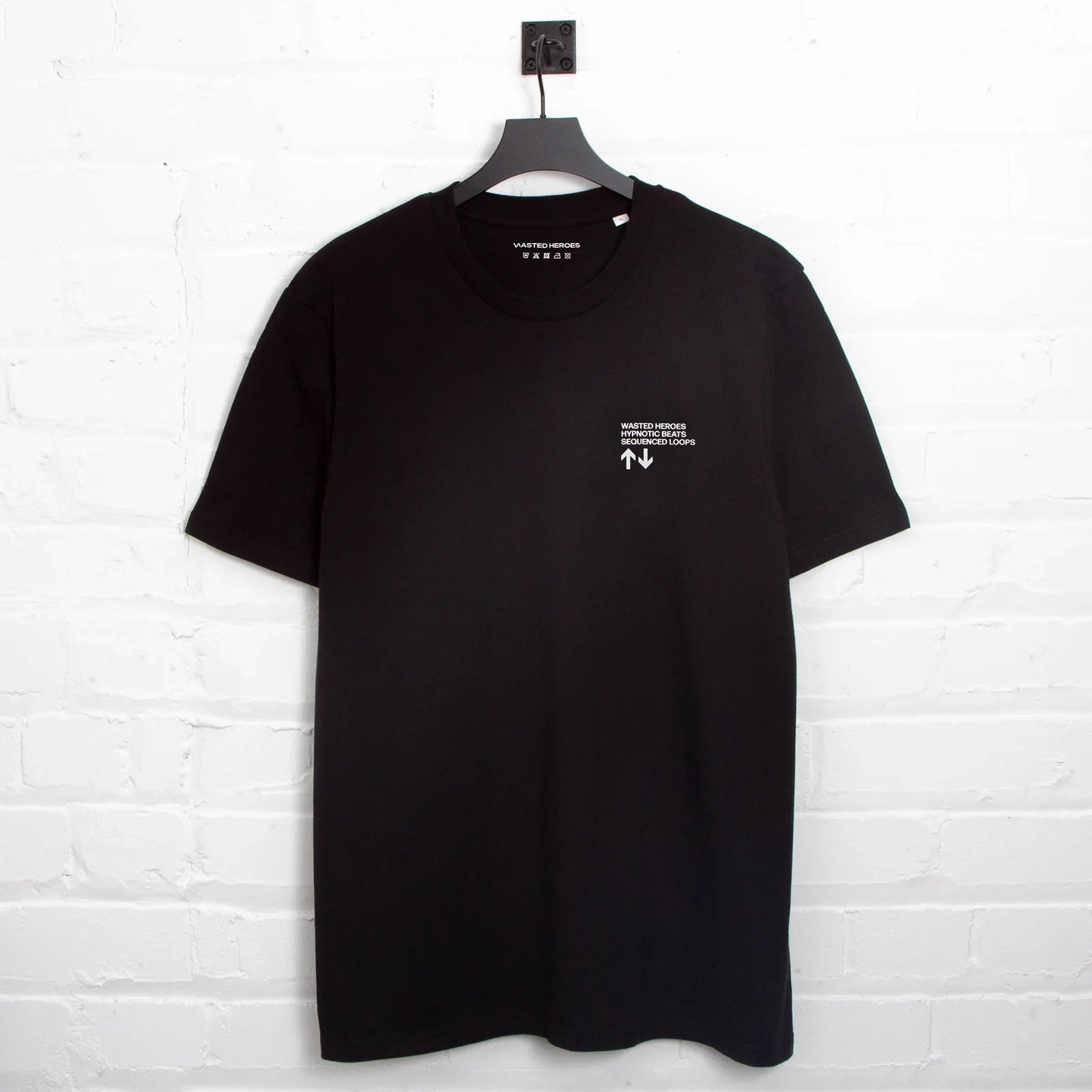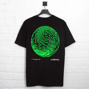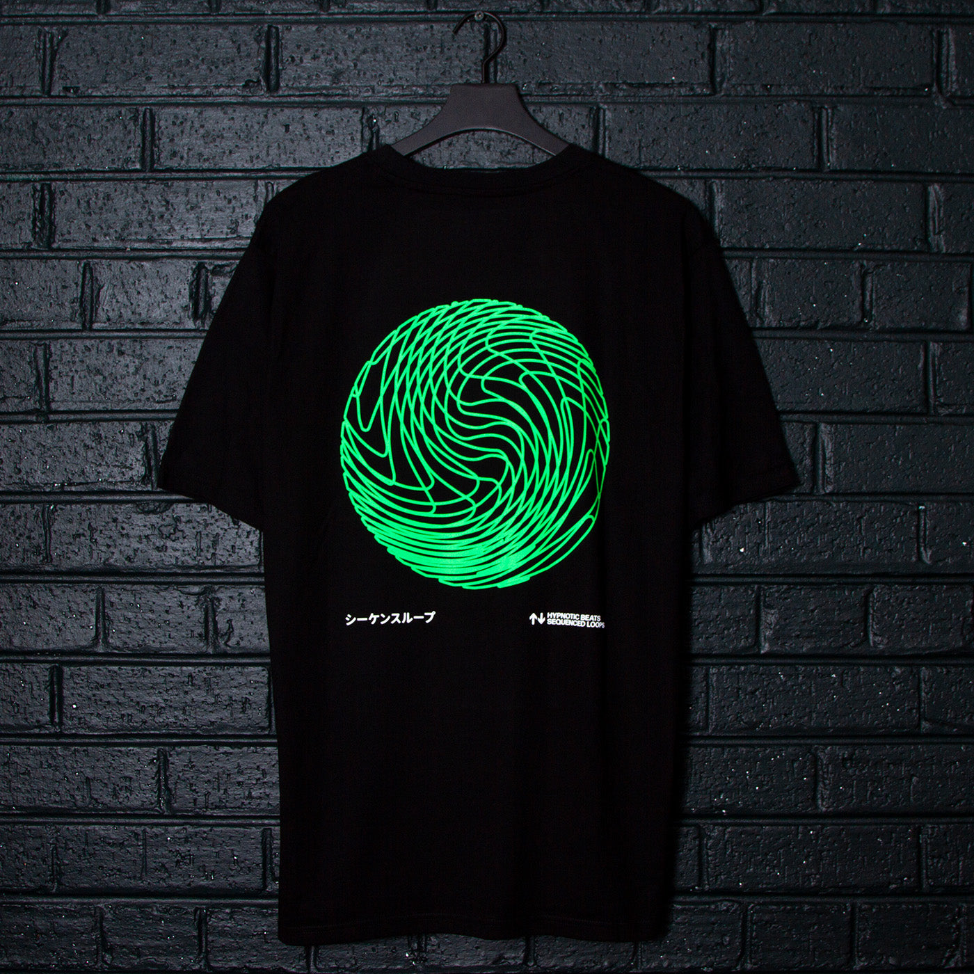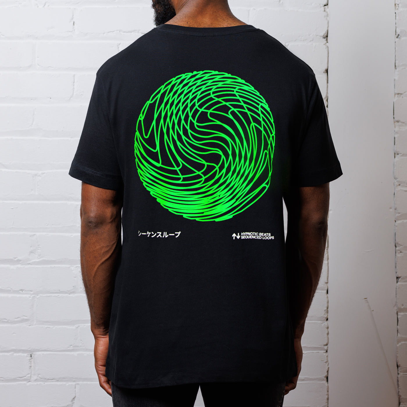 Twisted and tumbling lines form our classic Sequence Sphere 'Hypnotic Loops' t-shirt.