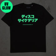 We create each T-shirt using a white base layer, followed by a second layer of UV ink applied as a fine dot pattern for maximum glow effect.