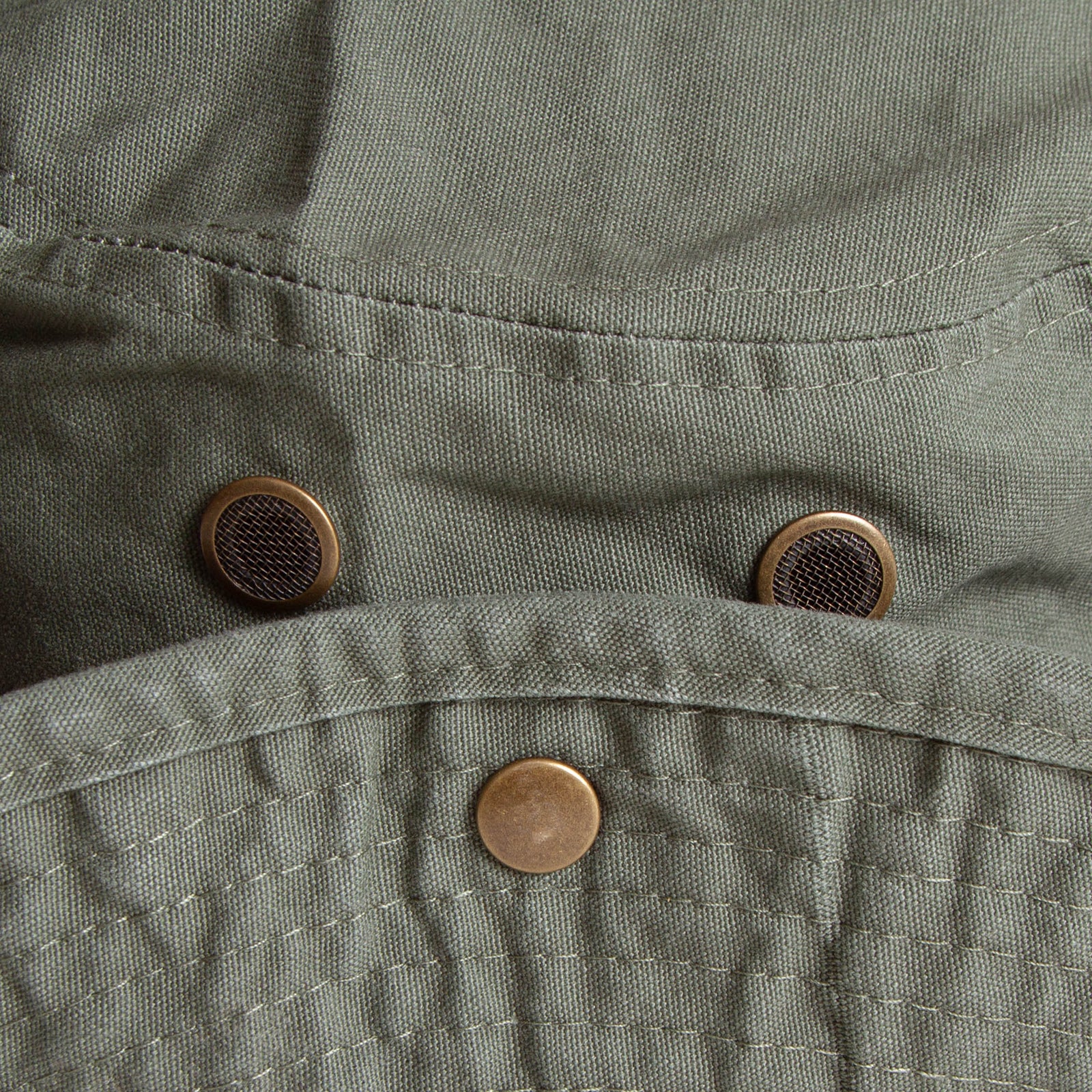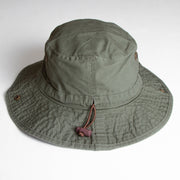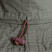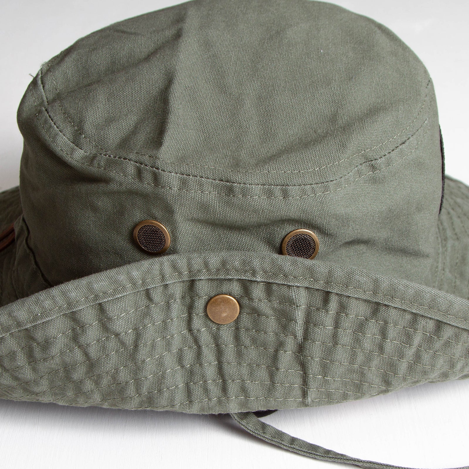 100% Heavy Washed Cotton with chin strap and toggle. One size fits most due to the elasticated cord adjuster.