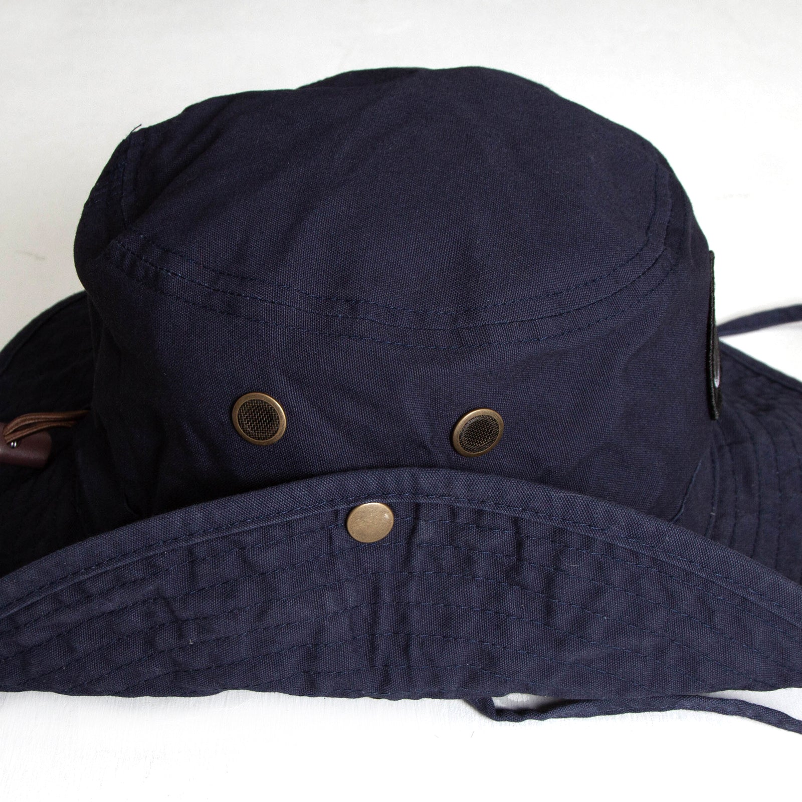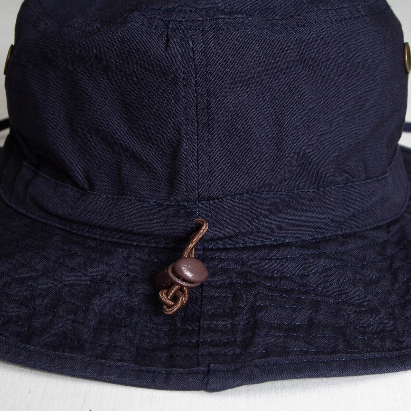 100% Heavy Washed Cotton with chin strap and toggle. One size fits most due to the elasticated cord adjuster.