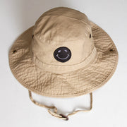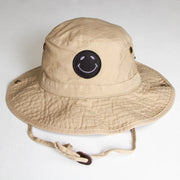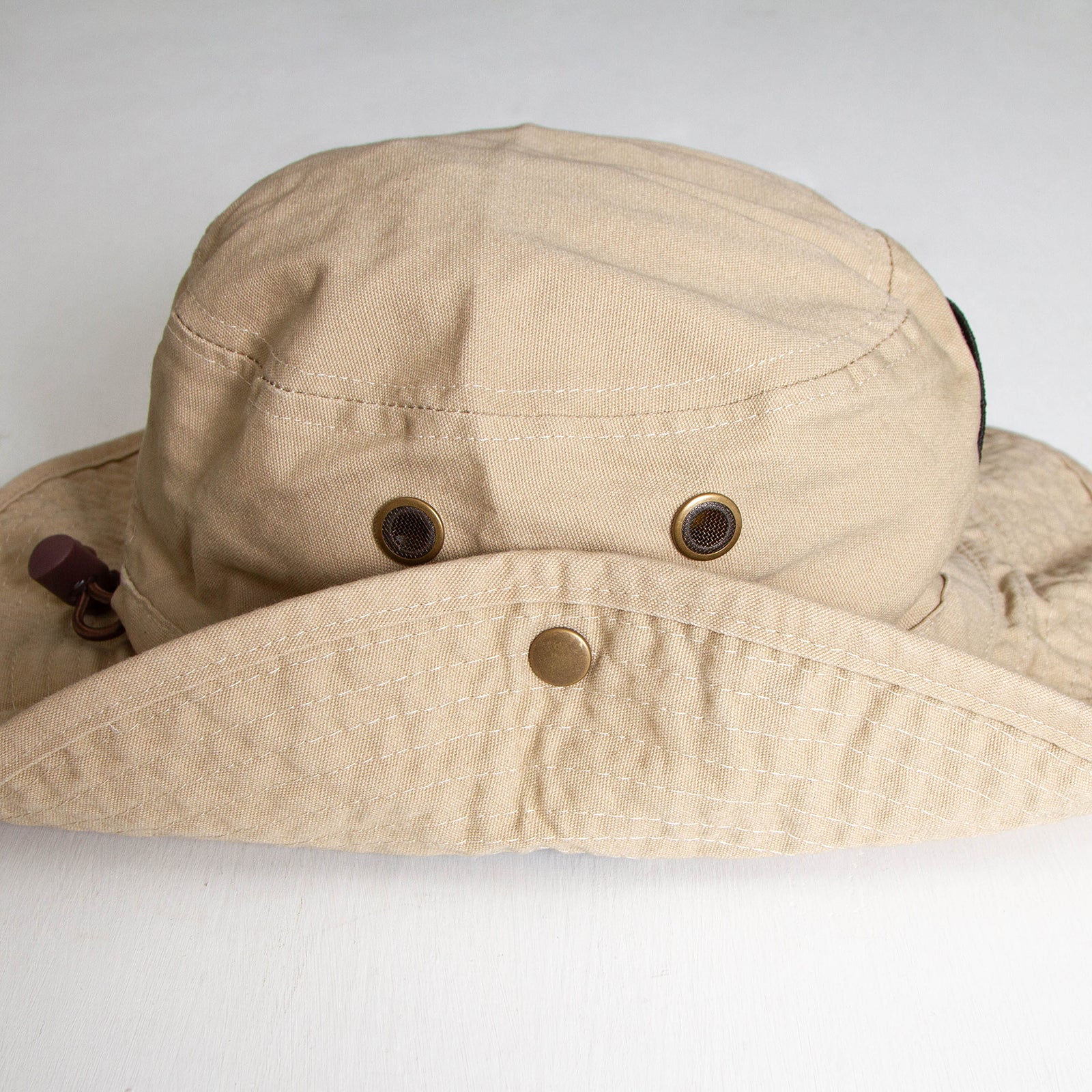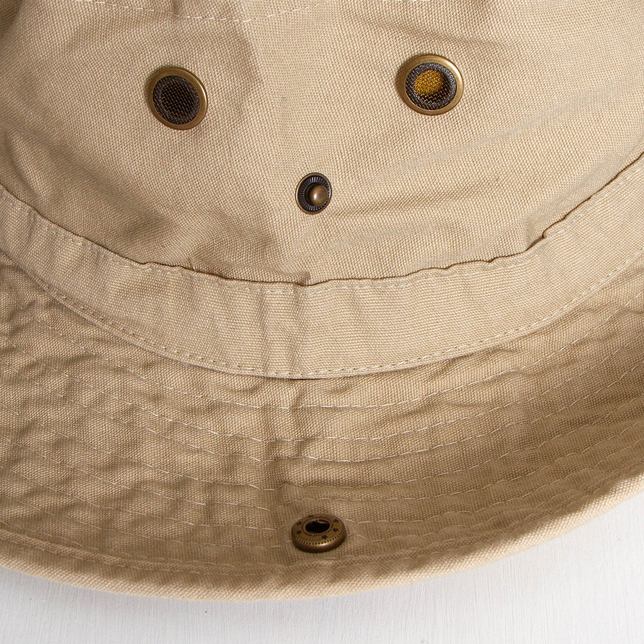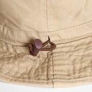 100% Heavy Washed Cotton with chin strap and toggle. One size fits most due to the elasticated cord adjuster.