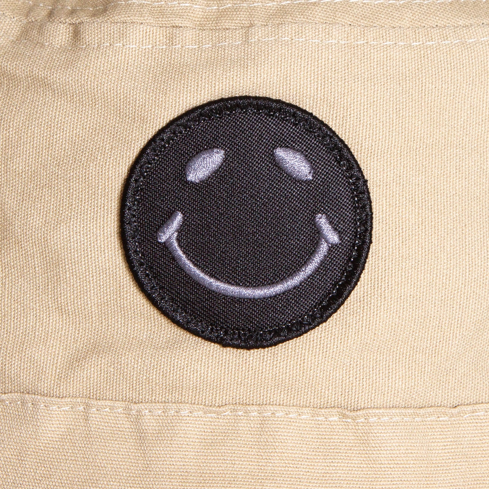 Black on Black Smiley Draw String Bucket Hat with embroidered badge.
