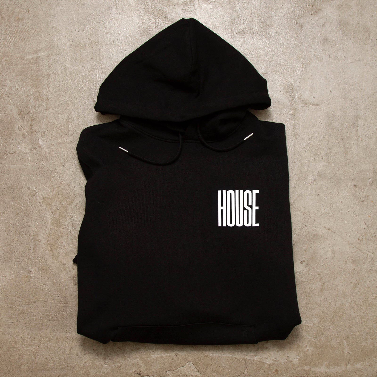 House Music All Night Long. The typography Higher House Hoodie. Large back print graphic with small front crest. Screen-printed in-house by us on a unisex heavy-weight 100% Organic Cotton Hoodie (350gsm) using environmentally friendly water-based inks.