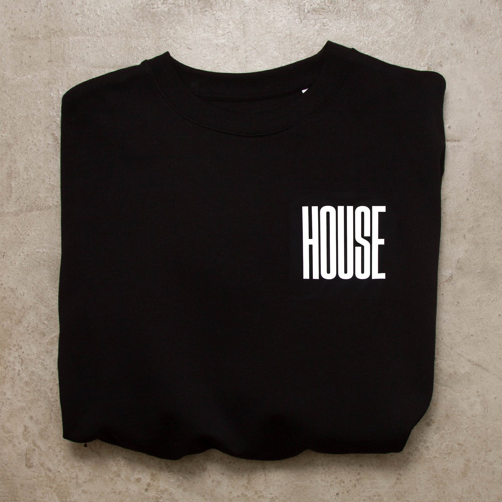House Music All Night Long. The typography Higher House Sweatshirt. Large back print graphic with small front crest. Screen-printed in-house by us on a unisex heavy-weight 100% Organic Cotton sweatshirt (350gsm) using environmentally friendly water-based inks.