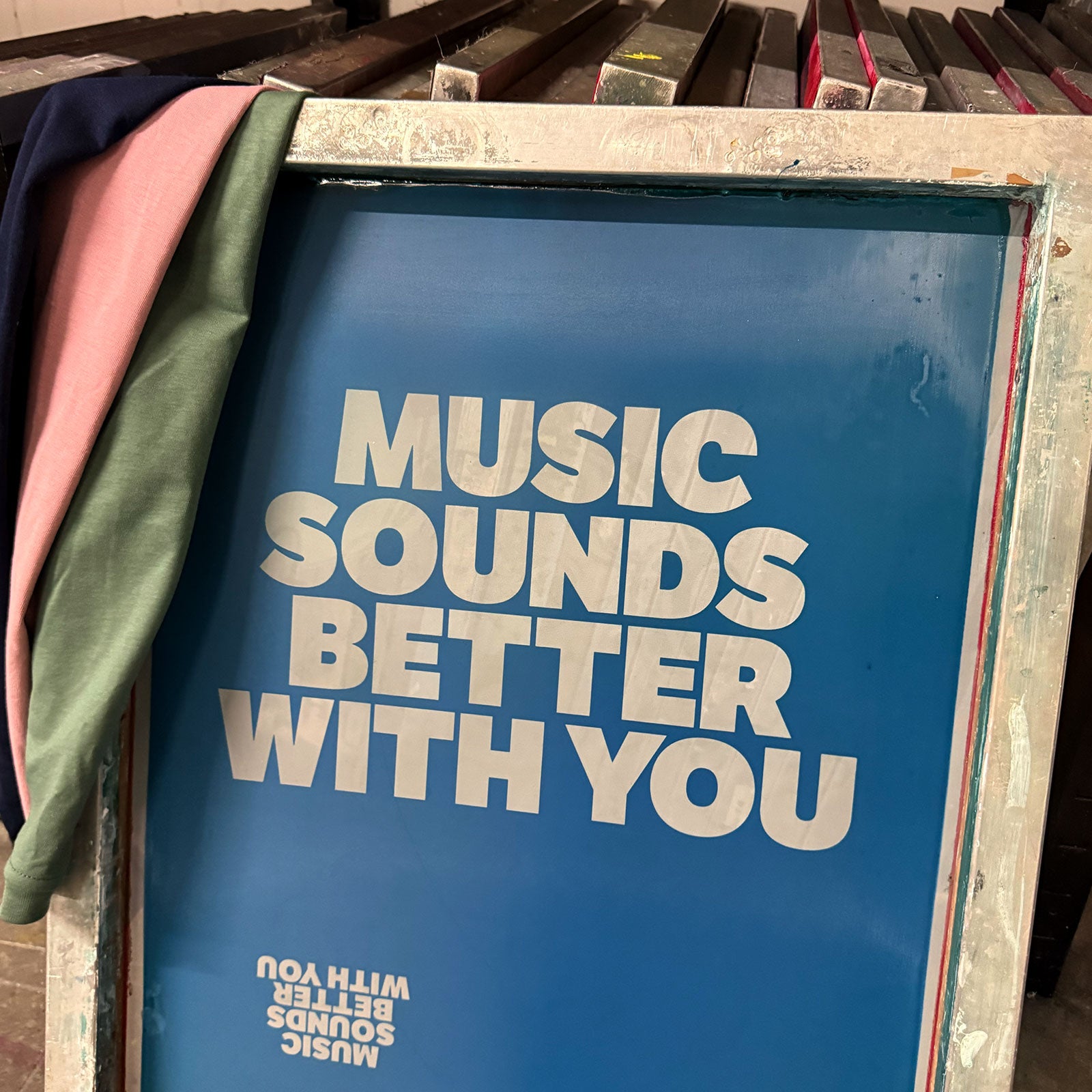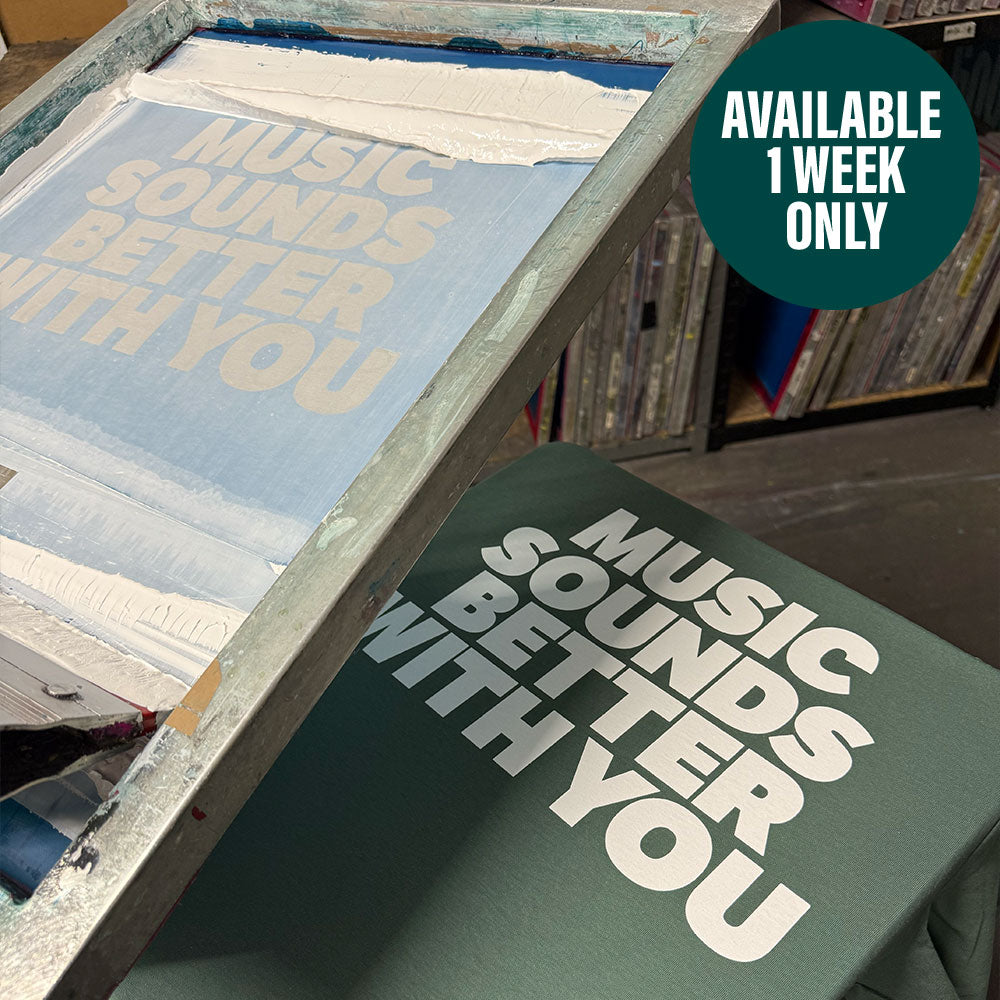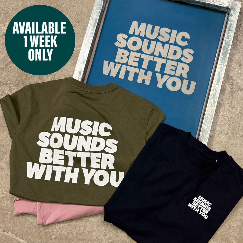 We create a screen featuring a song lyric and release it as a front or back print, available in 12 colours. After one week, we print all orders in a single batch, then the screen is deleted.