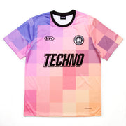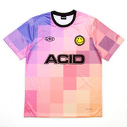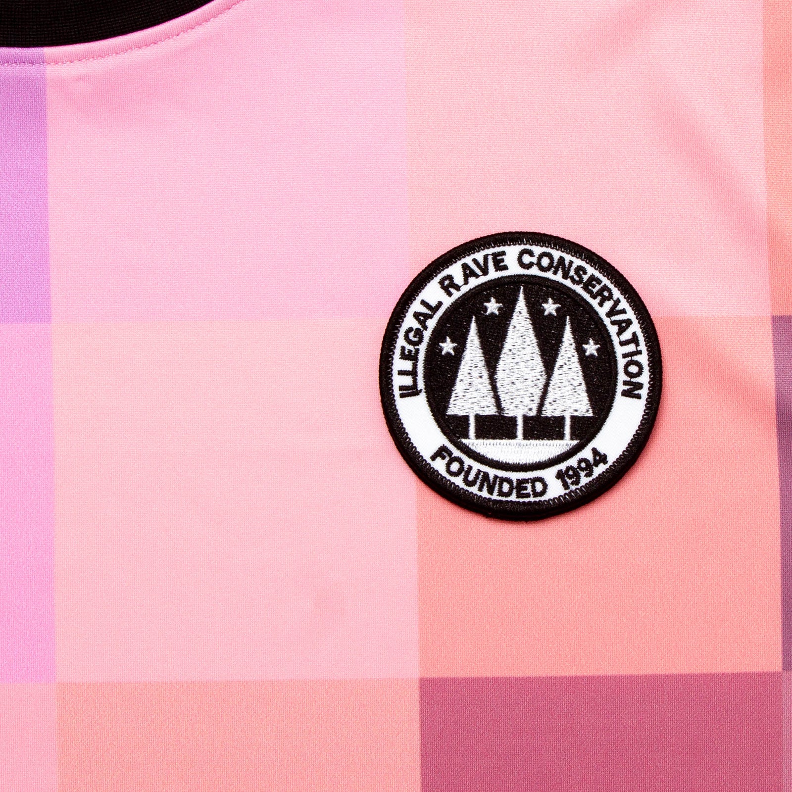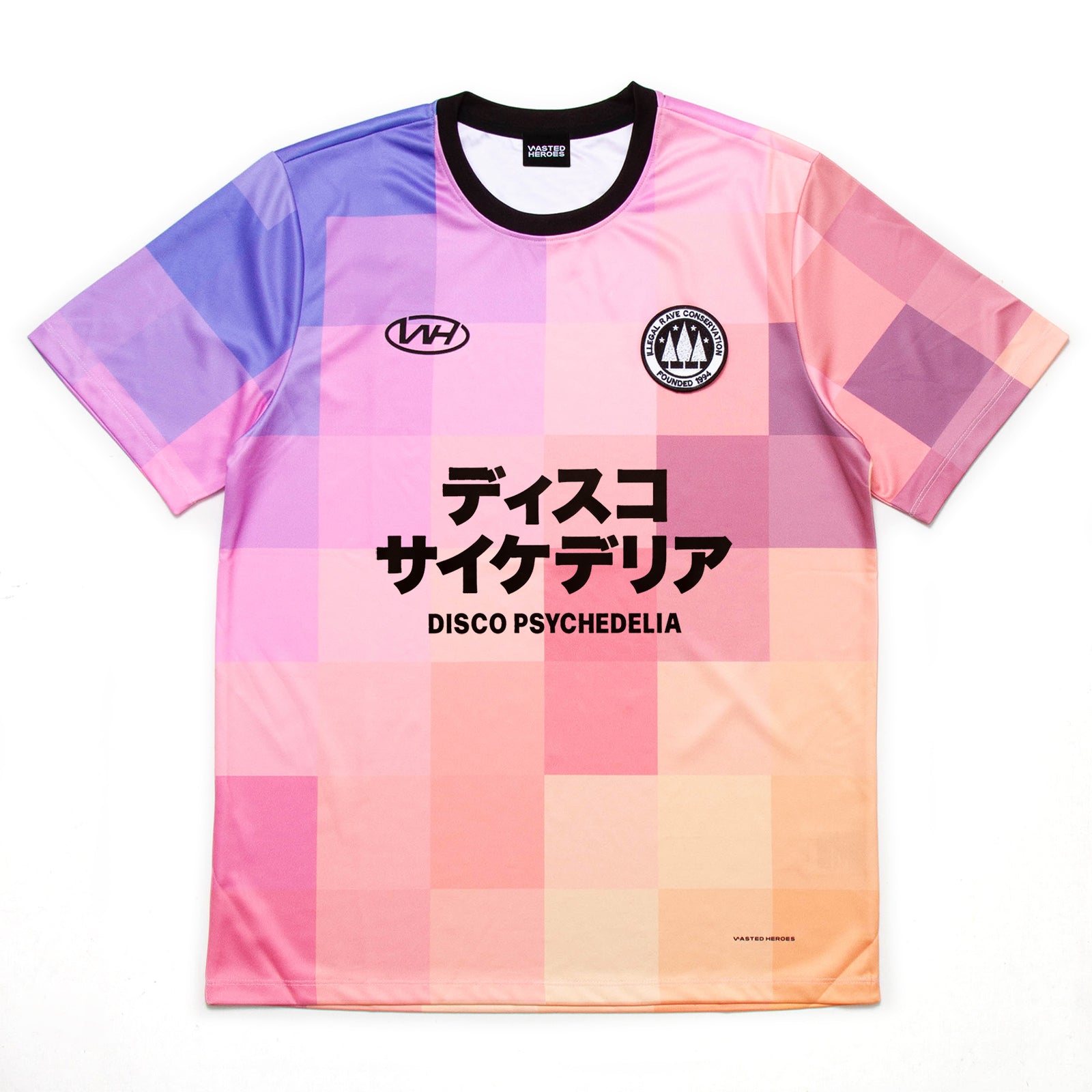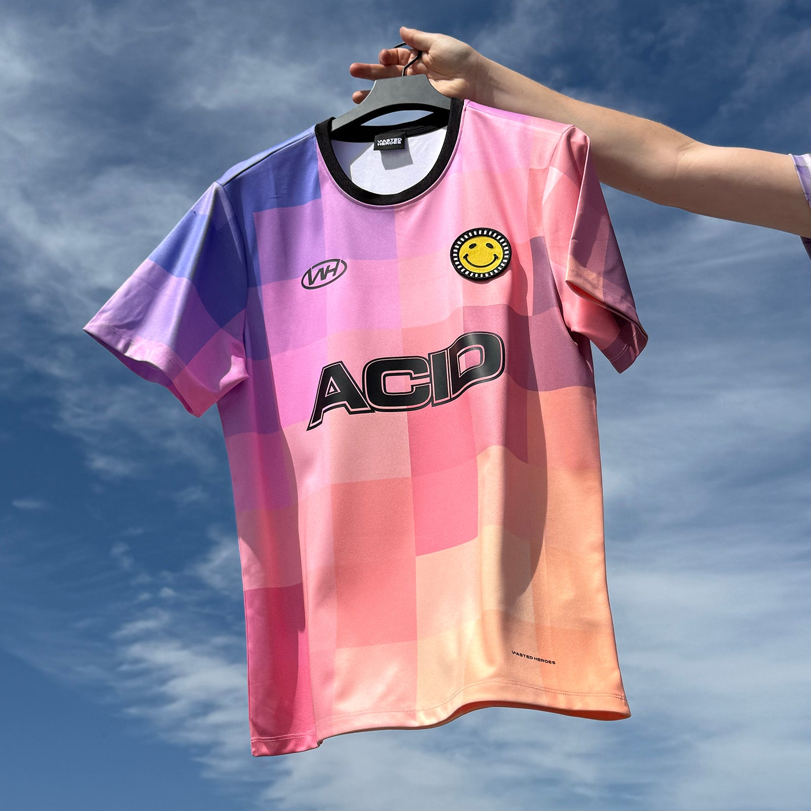 Our first ever custom pattern football jersey. The playa FC pixelated sunset was inspired by sunsets and beach vibes. Acid House, Disco Psychedelia, Techno and DNB sponsor choices. Plus choose between the Illegal Rave Conservation and Smiley team badge.