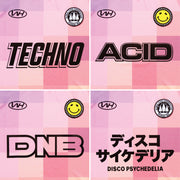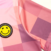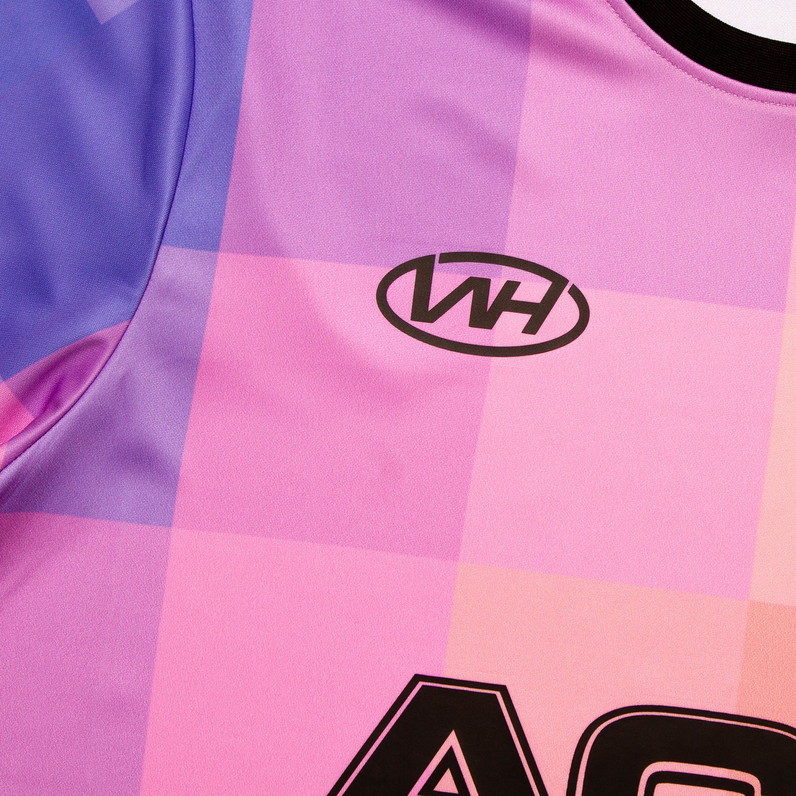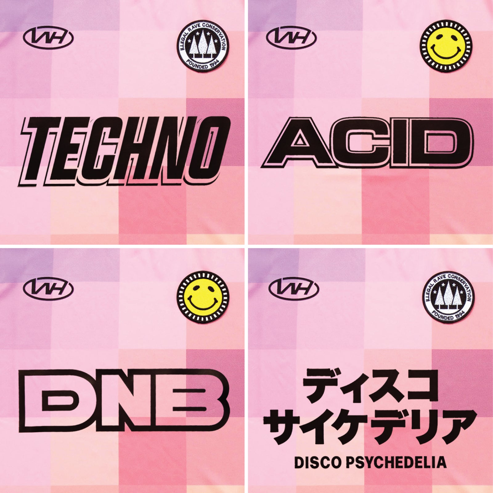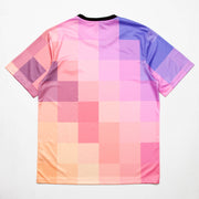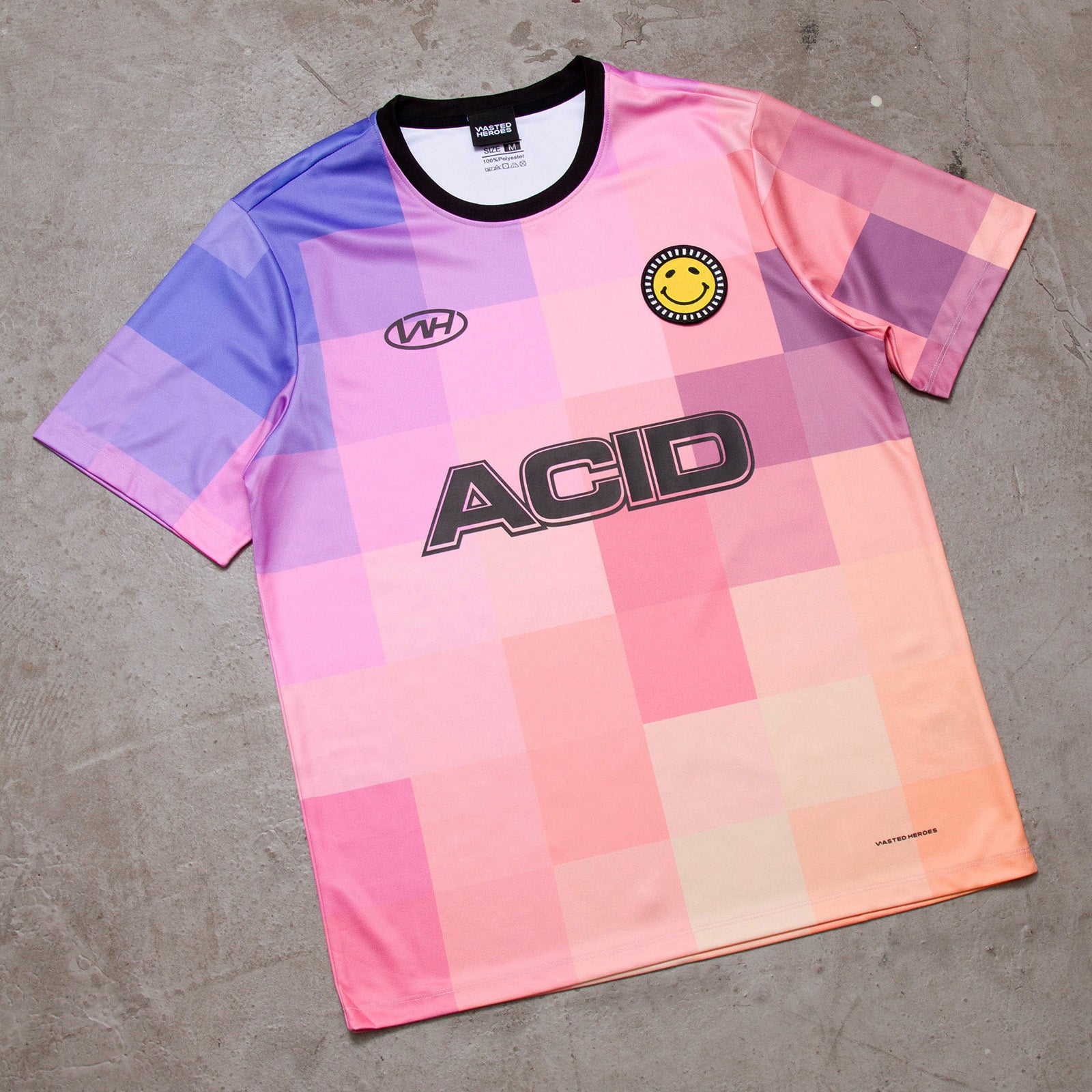 Our first ever custom pattern football jersey. The playa FC pixelated sunset was inspired by sunsets and beach vibes. Acid House, Disco Psychedelia, Techno and DNB sponsor choices. Plus choose between the Illegal Rave Conservation and Smiley team badge.