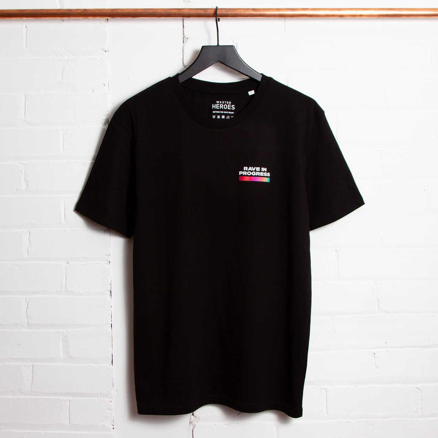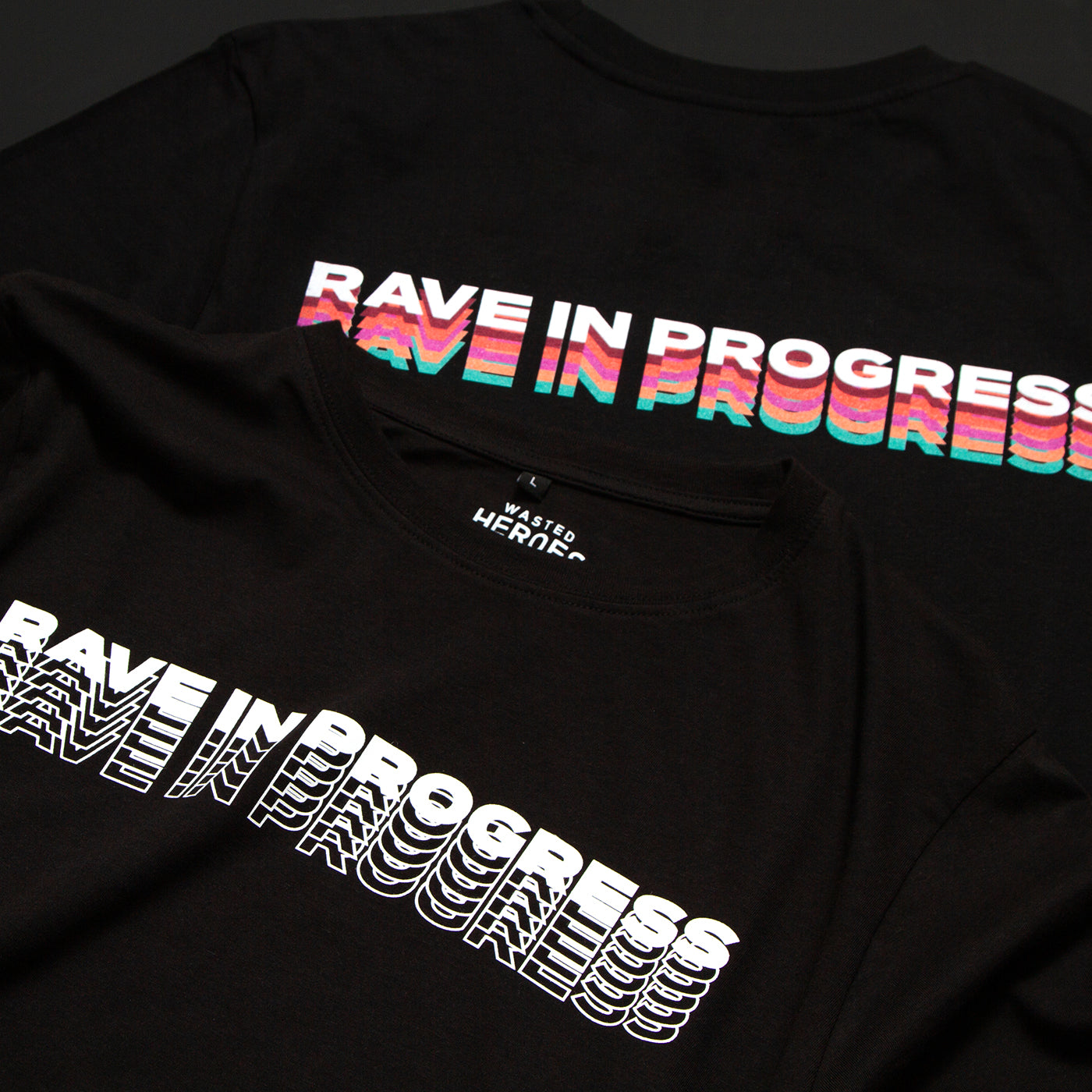 Rave In Progress T-shirt. Wasted Heroes Remixed collection. Digitally printed on a style of your choice. Regular, Longline, Heavyweight and Oversized.