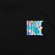 House Music All Night Long. The typography Higher House sweatshirt with retro triangle graphic fill. Large back print graphic with small front crest. Printed in-house by us on a unisex heavy-weight 100% Organic Cotton sweatshirt (350gsm).